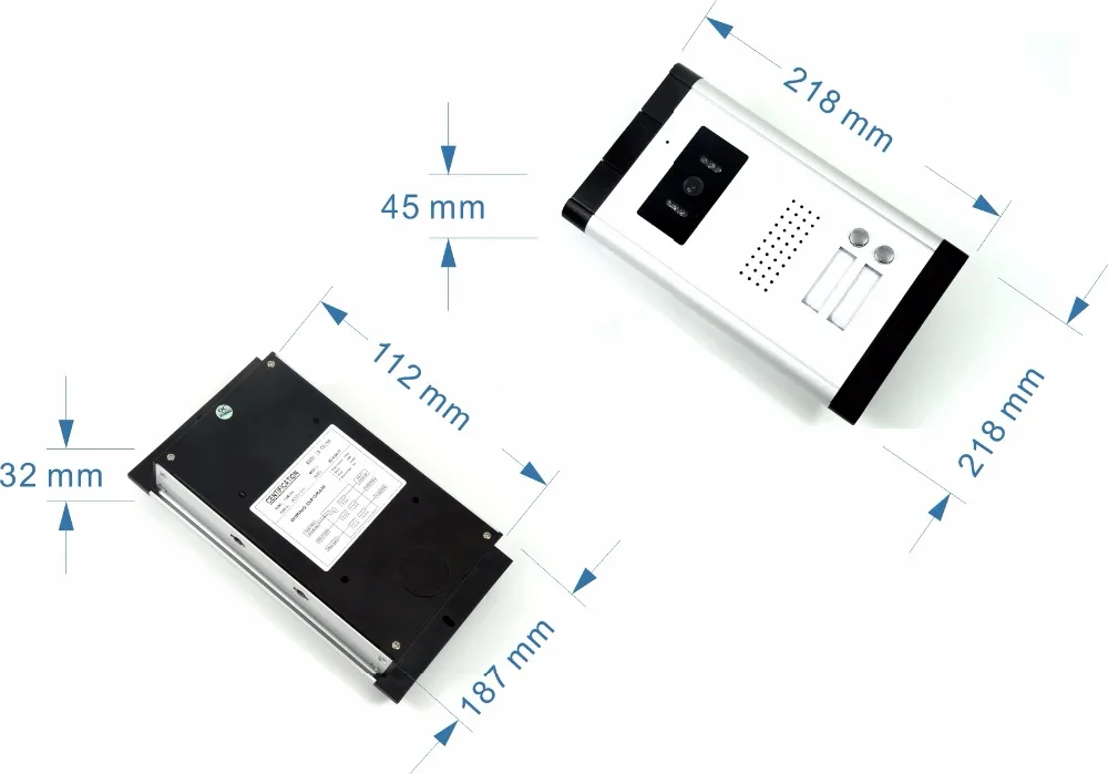 >>>Technical parameter:Indoor Monitor:Display: 7 inch TFT LCD screen (16:9 dispaly).Resolution: 800 X 480.Input: AC 100-240V 50Hz-60Hz. Output: DC 15V/1500mA. Case: ABS Engineering Plastics. Installation:Surface mounting.Outdoor camera: Camera resolution: 700Lines. Camera: 1/3 Color CMOS Camera.Built-in microphone and speaker Power Adapter: From Monitor, DC15V.Viewing angle: (U/D/L/R, degree): 60/35/70/70. Connection: 4 cored wire (Up to 12 monitors). Case: Aluminum material, weatherproof.>>>Standard package 1pcs 2 Buttons Outdoor Unit2pcs Indoor Monitor2pcs Power Adapter1pcs test cableAccesory packUser manual